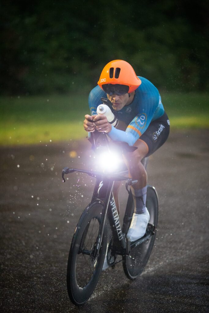 I used a specialized shivv disc tri, I think it is one of the fastest tt bikes out there at the moment and also has some added features that make it more easy to do long distance racing. I used an extra fuel box to put food in so it was easy to hand over food for 1 hour from the following car. I used a custom made extension with my water bottle attached to it. This way I could drink while I stayed in position. further I used an aero helmet that was tested to be the fastest helmet for my body. The bike had a single front chainring and a 10-18 12 speed sram cassette. This results in a perfect straight chain line at 39-43 km/h at about 90 rpm. The wheels I used were a Princeton carbon disc in the back and a coda 10cm front wheel. both with continental gp5000 TT tubeless tires. I used the aero overshoes from sockeloen. and wahoo aero speedplay pedals.